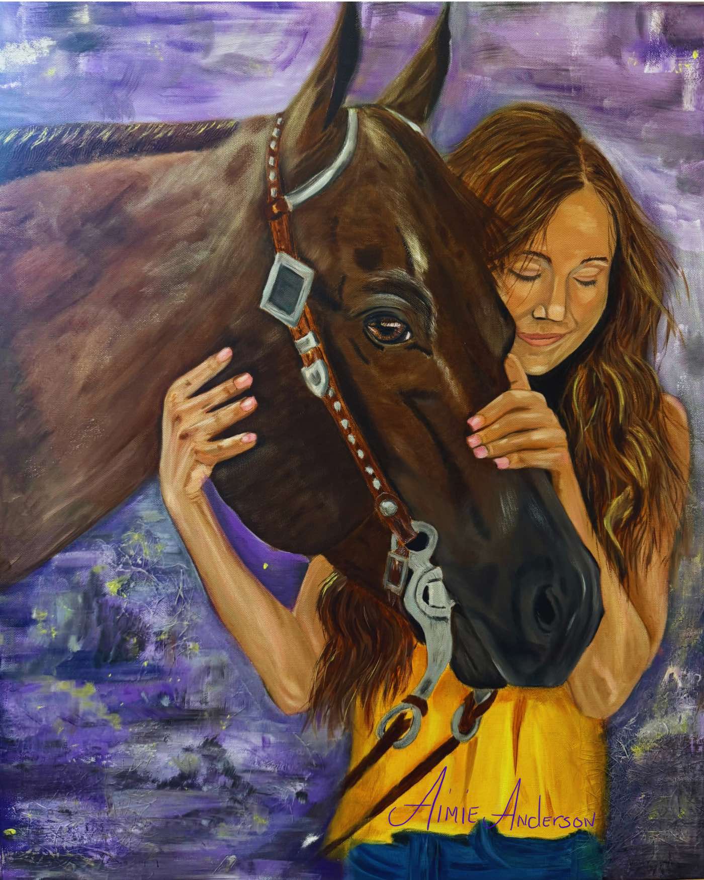 An expressive paper print of oil painting of a young girl gently embracing a horse, capturing a moment of deep, unspoken connection. The horse stands calmly beside her, unbridled, symbolizing freedom and trust. Soft, earthy tones and fluid brushstrokes evoke warmth, serenity, and a bond beyond words. Titled "Unbriddled Love."